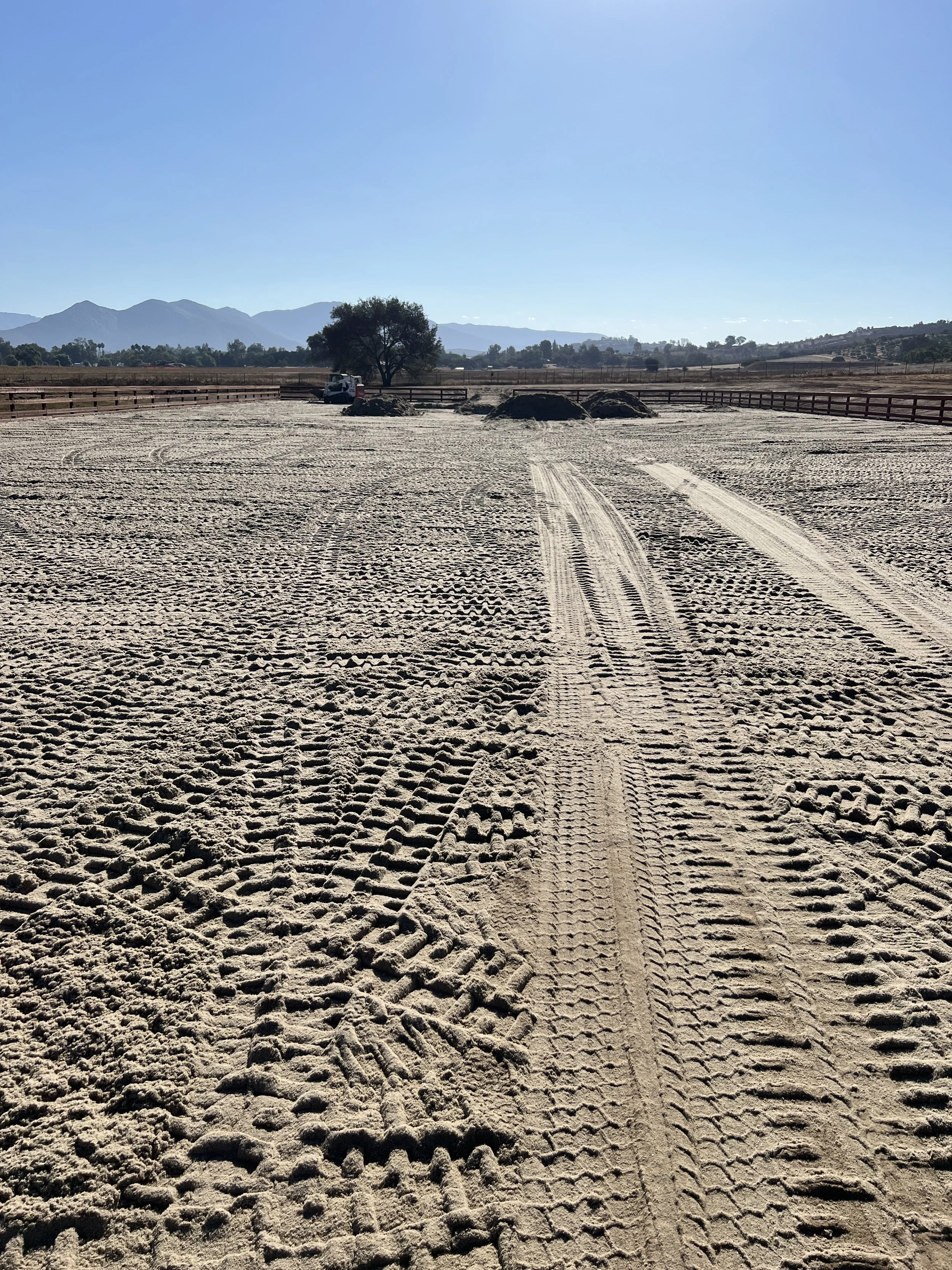 The first step was clearing the land and grading. We took out old steel fencing and cleared some pepper trees that obstructed the arena. They made sure to be mindful of the surrounding areas, not putting the arena in a position to flood. Drainage was the first priority, but they hit a major pipe early on in the process. Because we were not given any master plans of the waterlines, this was a common occurrence. The pipe was ultimately repaired and construction resumed on top of the pipe with the future plan of eventually diverting this pipe around the arena.
